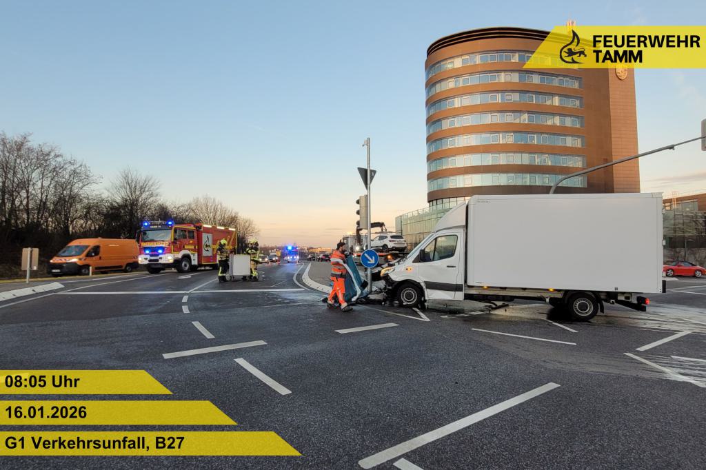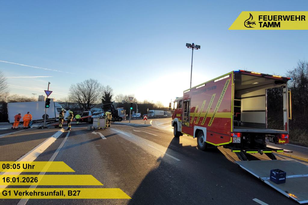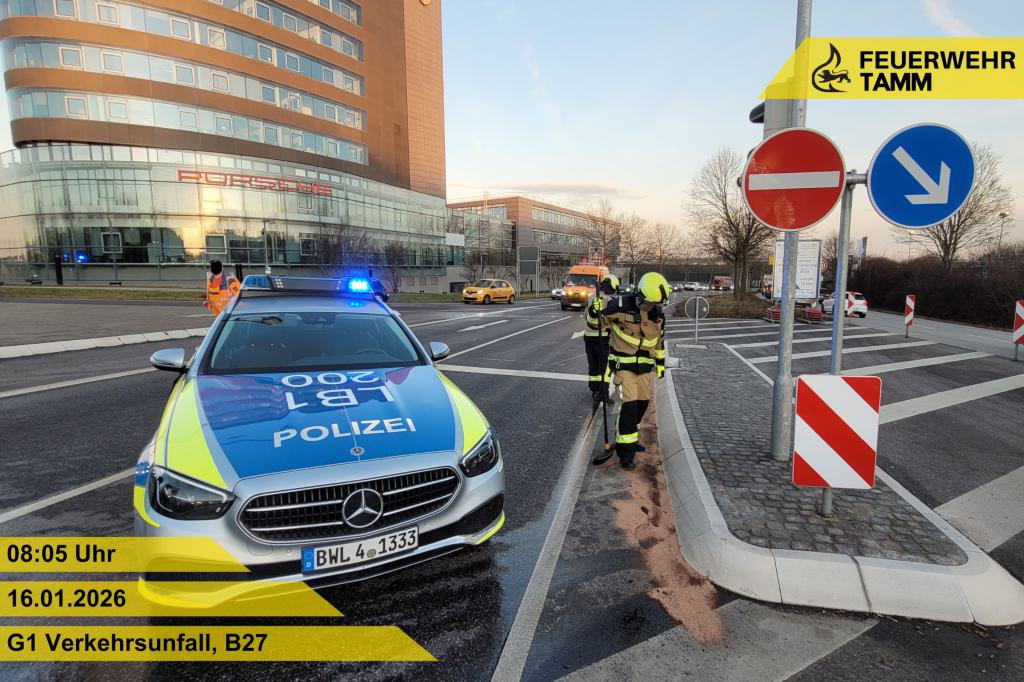 Die Feuerwehr Tamm wurde zu auslaufenden Betriebsstoffen nach einem Verkehrsunfall auf die B27, Porschekreuzung, alarmiert.