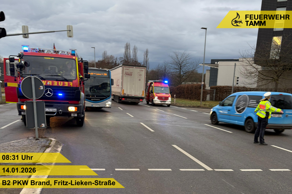 Die Feuerwehr Tamm wurde zu einem PKW Brand im Kreuzungsbereich der Fritz-Lieken-Straße alarmiert.