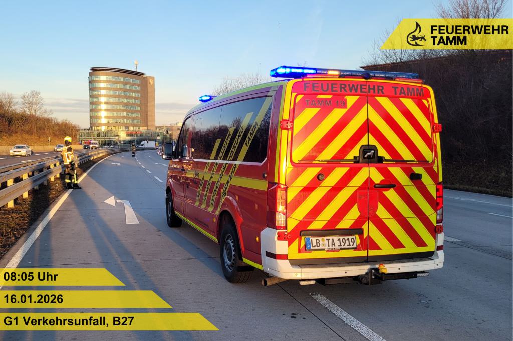 Die Feuerwehr Tamm wurde zu auslaufenden Betriebsstoffen nach einem Verkehrsunfall auf die B27, Porschekreuzung, alarmiert.