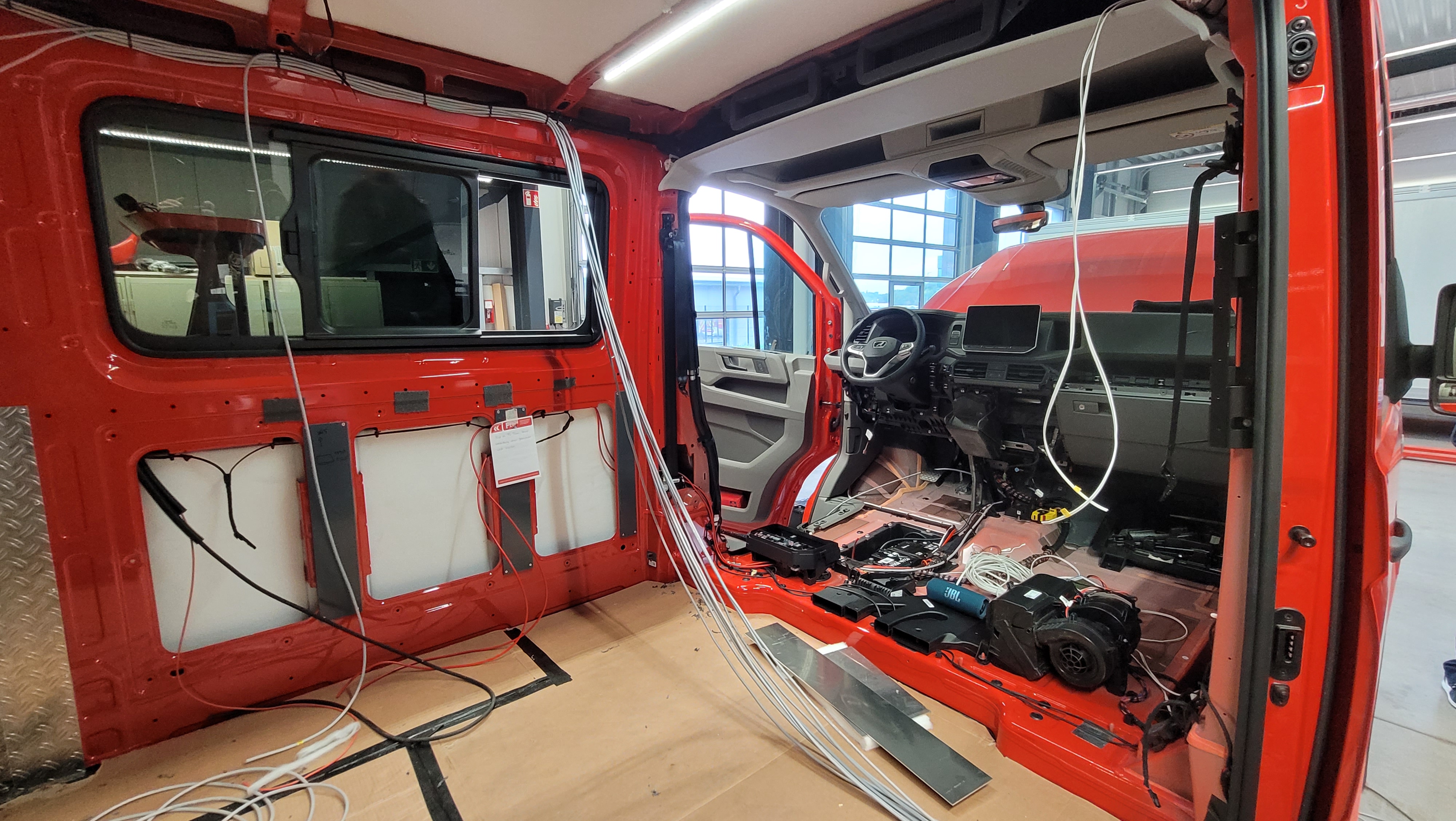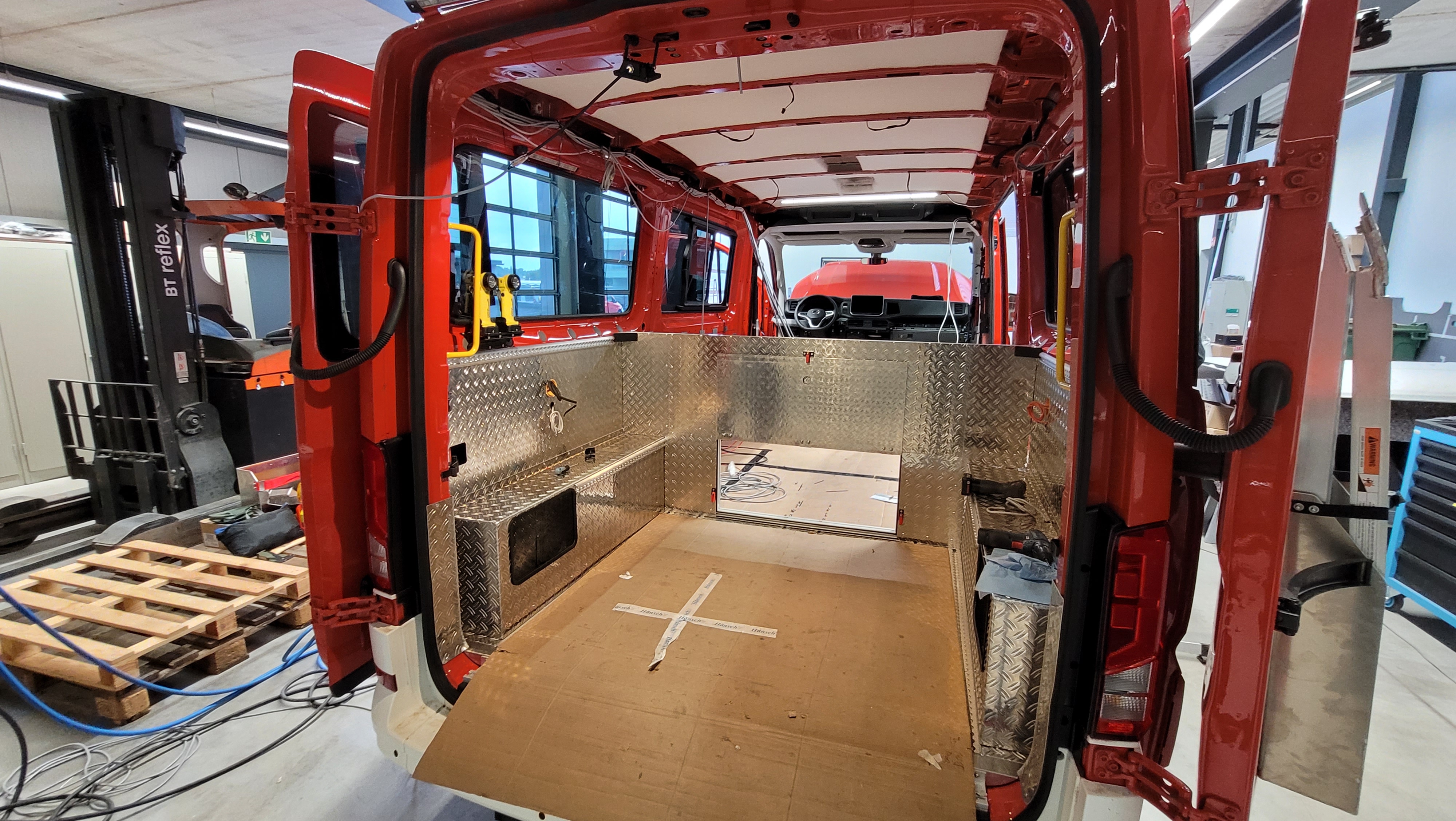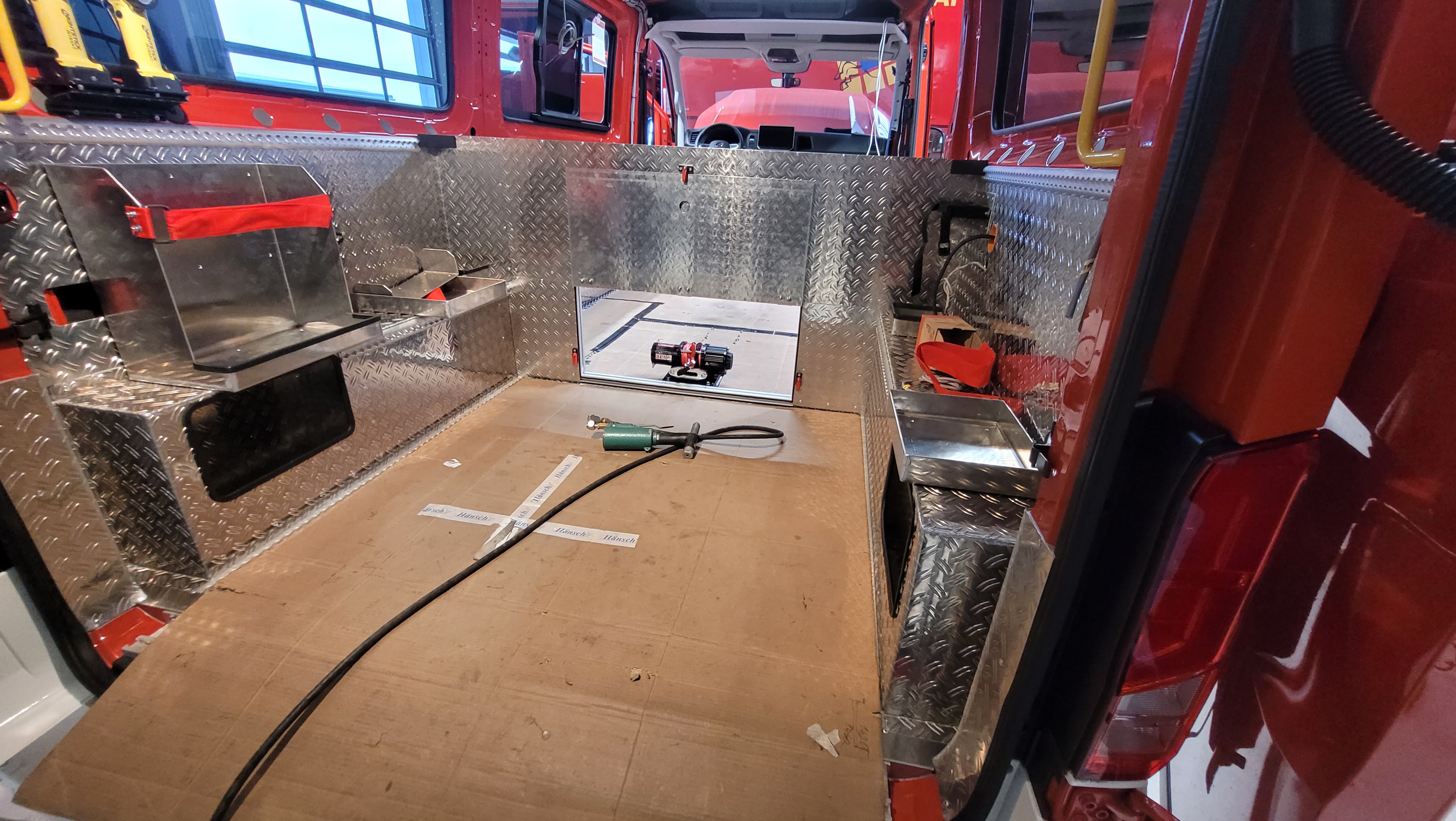 Der neue MTW ist nun im Innenausbau. Am vergangenen Montag wurde hier eine Zwischenabnahme durchgeführt. Erste Leitungen für die Sondersignalanlage und die zusätzlichen Fahrzeugsteuerungen sind verbaut, sowie der Heckbereich fast vollumfänglich mit Blecharbeiten ausgeführt.